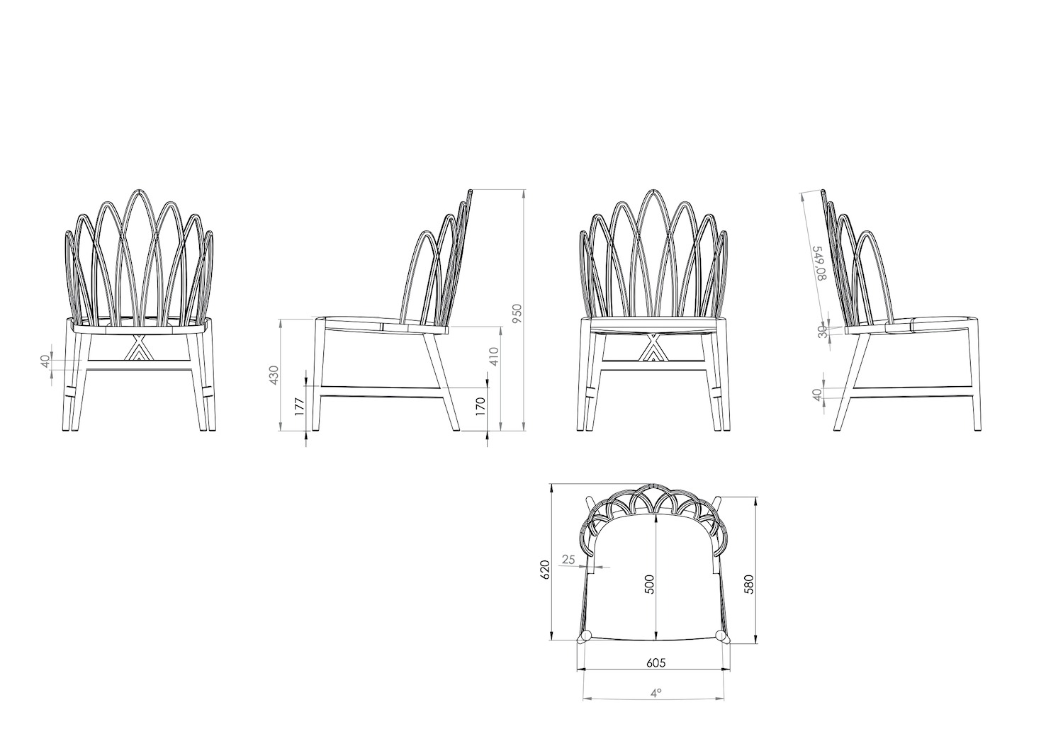 Pour les chaises et les fauteuils par exemple la superposition et la jonction des « plumes » forment un entrelacs, travail remarquable de l’ébéniste sur un dessin en arche brisée.