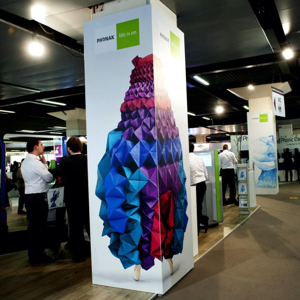 • Si vous avez un poteau sur votre stand transformez le en avantage pour l’habiller à votre communication, notamment en partie haute, au-dessus du niveau des autres stands pour être visible de loin