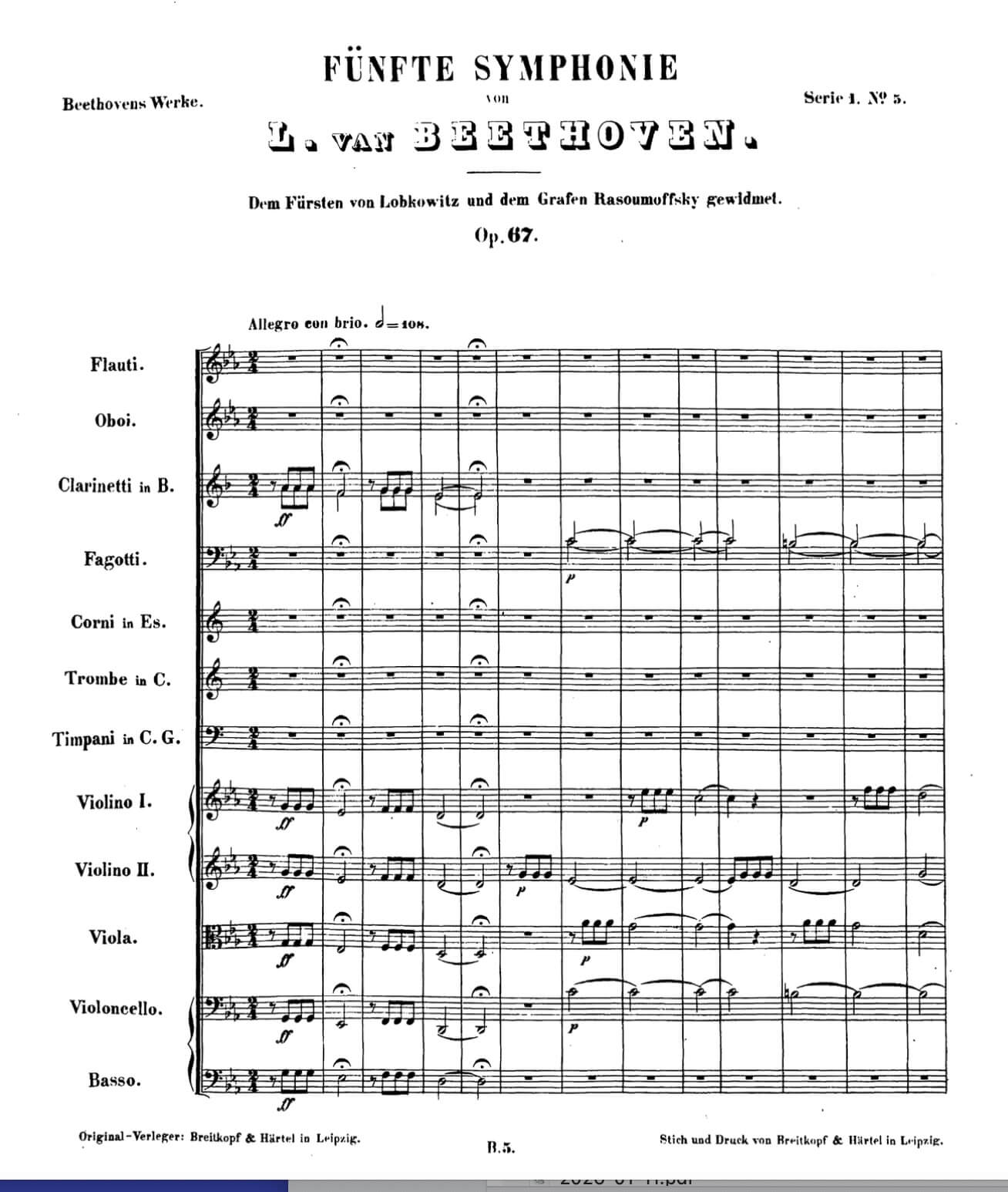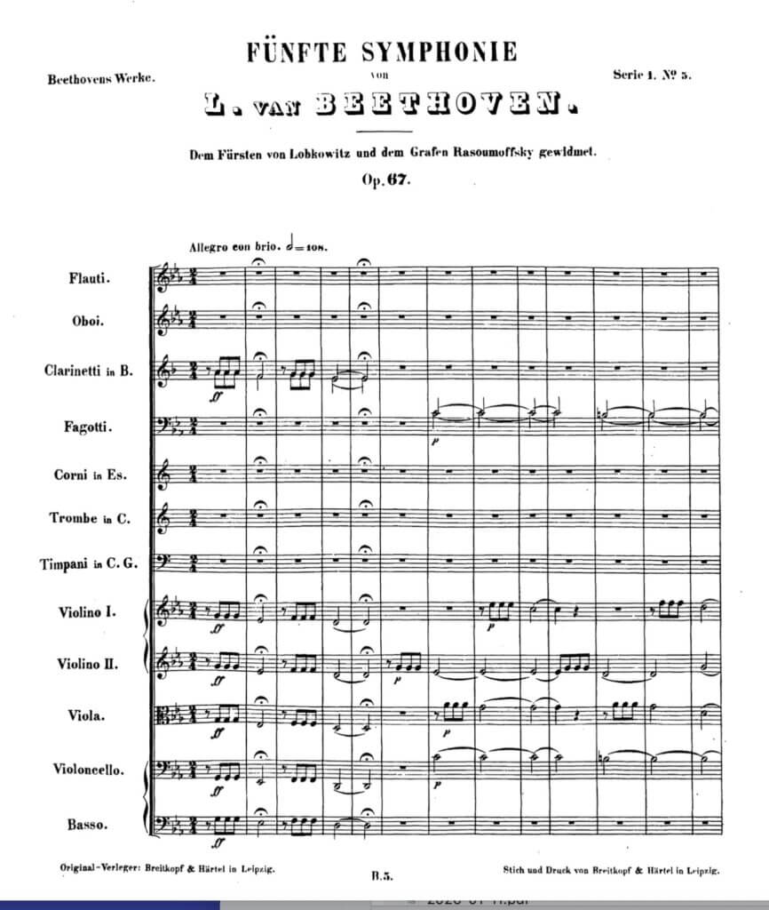 Ici, pour un exemple lisible pour tous, la partition de direction des premières mesures de la 5e Symphonie de LvBeethoven