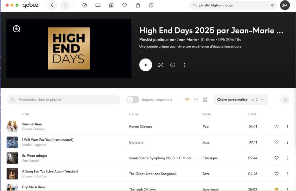 Pour les démonstrations j’utiliserai mes vinyles, mes CD et ma playlist spécialement concoctée pour vous sur QOBUZ , ce qui vous permettra, avant et après les « High End Days » de tester, d’écouter et de comparer