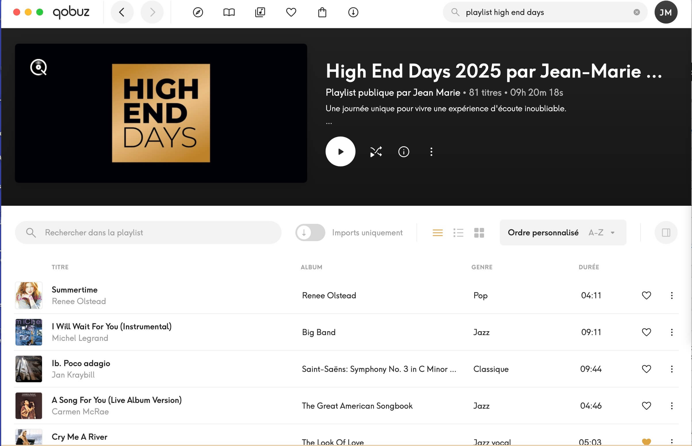 Pour les démonstrations j’utiliserai mes vinyles, mes CD et ma playlist spécialement concoctée pour vous sur QOBUZ , ce qui vous permettra, avant et après les « High End Days » de tester, d’écouter et de comparer